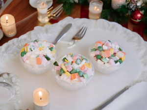 Мыло выполнено в виде праздничного салата, уложенного в хрустальную вазочку — и ваза тоже сделана из мыла!