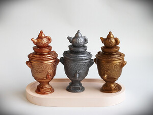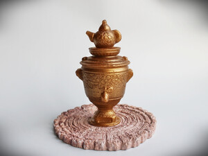 Изделие ручной работы выполнено в форме самовара, что делает его не только полезным, но и декоративным элементом для ванной комнаты.