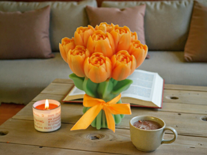 Изысканная свеча в форме букета тюльпанов —это гармоничное сочетание эстетики, натуральности и уюта.